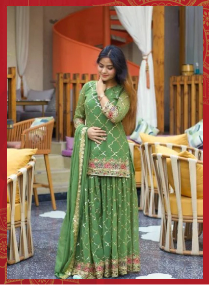 Elegant Olive Green Chinon Sharara Set featuring a stylish kurta with a flowy sharara. Made from premium Chinon fabric, perfect for festive occasions, weddings, and celebrations.