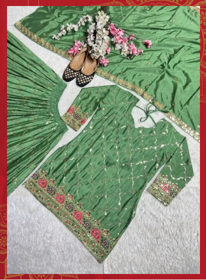 The Olive Green Chinon Sharara Set is a perfect blend of elegance and contemporary ethnic style. Crafted from premium Chinon fabric, this outfit features a beautifully designed kurta paired with a flowy sharara that adds graceful movement to your look. The rich olive green color enhances its luxurious appeal, making it ideal for festive occasions, weddings, and special gatherings.